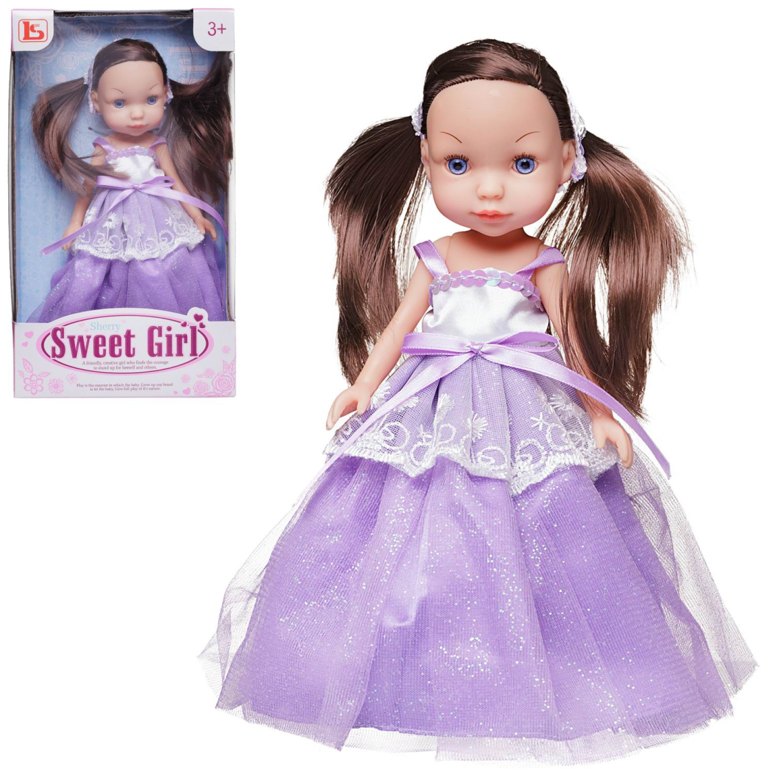 Симпатичная куколка с двумя игривыми хвостиками от бренда Junfa будет хорошим дополнением коллекции кукол девочки, ей обязательно понравится такая красивая новая подружка. У куклы миловидное лицо с большими голубыми выразительными глазами, длинные каштановые волосы. Кукла одета в красивое нарядное платье, сшитое из мерцающей нежно-фиолетовой ткани, дополнительно украшенное белыми кружевами и пайетками. У куколки подвижны руки и ноги, наряд можно снять, по желанию игрушку можно переодеть. Играя с ней, девочка сможет разыгрывать сценки, придумывая интересные сюжеты.