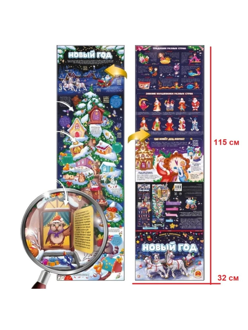 Серия «Плакат с окошками» от торговой марки Malamalama - новая форма с любимым содержанием. Это книжка-трансформер, которая развернётся в плакат и станет отличным украшением дома. Плакат с окошками «Новый год» - это чудесная возможность погрузиться в радостную атмосферу ожидания праздника. Книжка расскажет о том, как добрые лесные зверята украшают домики, готовят подарки и угощение, загадывают желания, веселятся, играют и встречают Дедушку Мороза. Вместе с ними ребёнок поверит, что под Новый год возможны любые чудеса. Переверните плакат - и малыш отправится в предновогоднее путешествие вокруг света, узнает множество интересных фактов о праздничных традициях народов мира и познакомится с зимними волшебниками разных стран. А красочные иллюстрации помогут расширить кругозор и создадут сказочное настроение. Количество страниц 8.