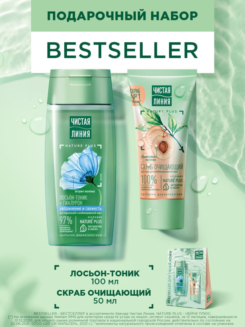 Подарочный набор для женщин Чистая Линия BESTSELLER — превосходный выбор для тех, кто хочет порадовать близких девушек и женщин, уделяющих внимание качественному уходу за кожей лица. Этот уходовый косметический набор в элегантной подарочной упаковке представляет собой сочетание базовых косметических средств, необходимых для полноценного ухода: очищающего скраба для лица и увлажняющего лосьона-тоника для лица. Благодаря компактному мини формату эти средства легко помещаются в косметичку или сумку, что делает их идеальными спутниками в дорогу, путешествие и отпуск. Они не занимают много места и позволят поддерживать красоту кожи в любых условиях.