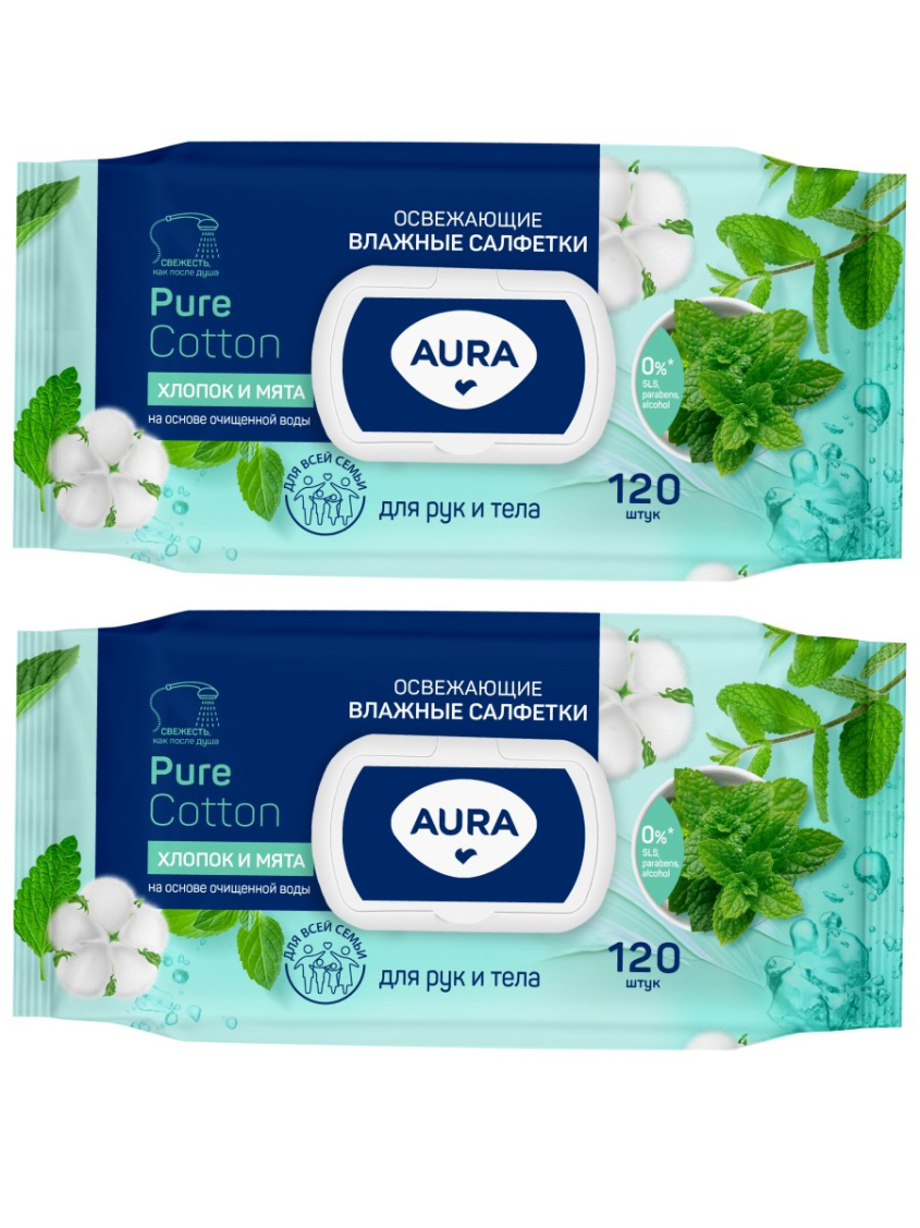 Влажные салфетки освежающие Aura Family big-pack с крышкой, 120 шт - это два незабываемых аромата "Хлопок и зелёный чай" и "Хлопок и мята".
