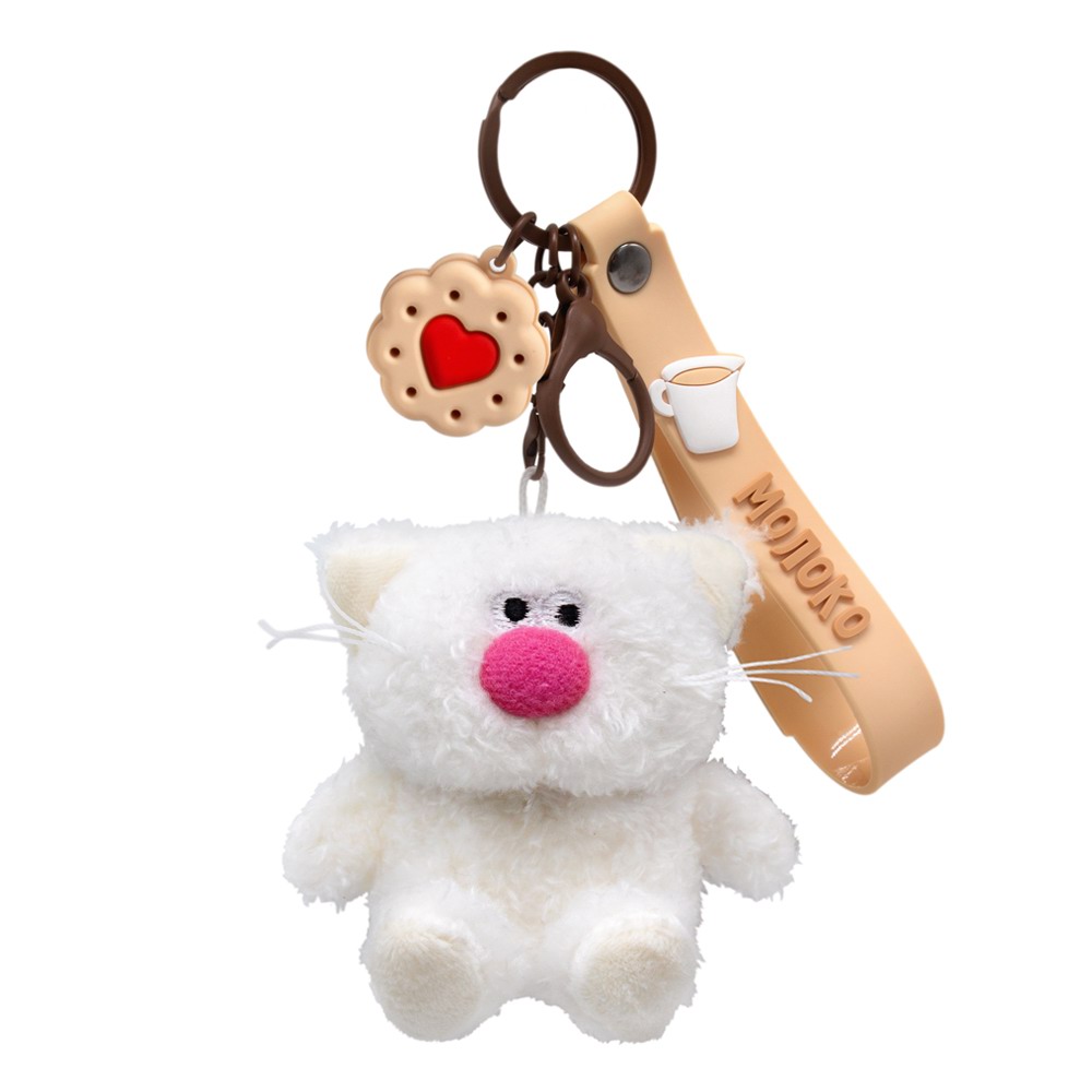 Кот брелок Молоко. Брелок сшит из тактильно приятного эко меха белоснежного цвета. Усики из шелковистого кручёного шнура. Объемный носик обтянут розовым софтом. Глазки вышиты. На пяточках и внутри ушек вшит молочный софт. Брелок крепится на кольцо шоколадного цвета с силиконовыми подвесами. Один подвес – это браслет с хештегом «маленькаяРАДОСТЬ» на кнопке и с фирменным логотипом «Кофейные коты». Другой подвес – печенье с розовым сердечком.