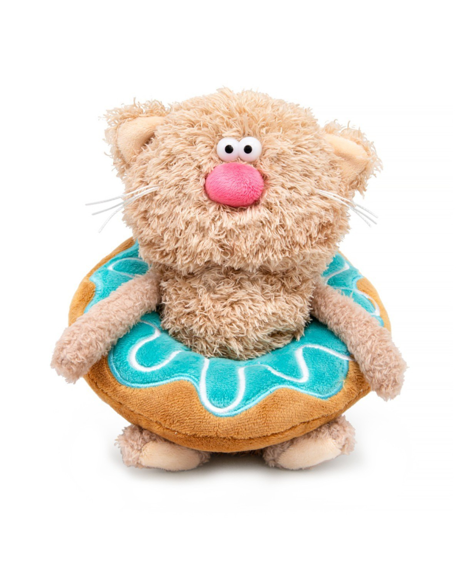 Очаровательный котик Какао из тактильно приятного эко меха цвета какао с молоком. Котик уютно расположился в милом пончике, который сшит из карамельного и голубовато‑бирюзового софта. Пончик украшен вышивкой и имеет петельку для того, чтобы его можно было использовать в качестве подвеса.