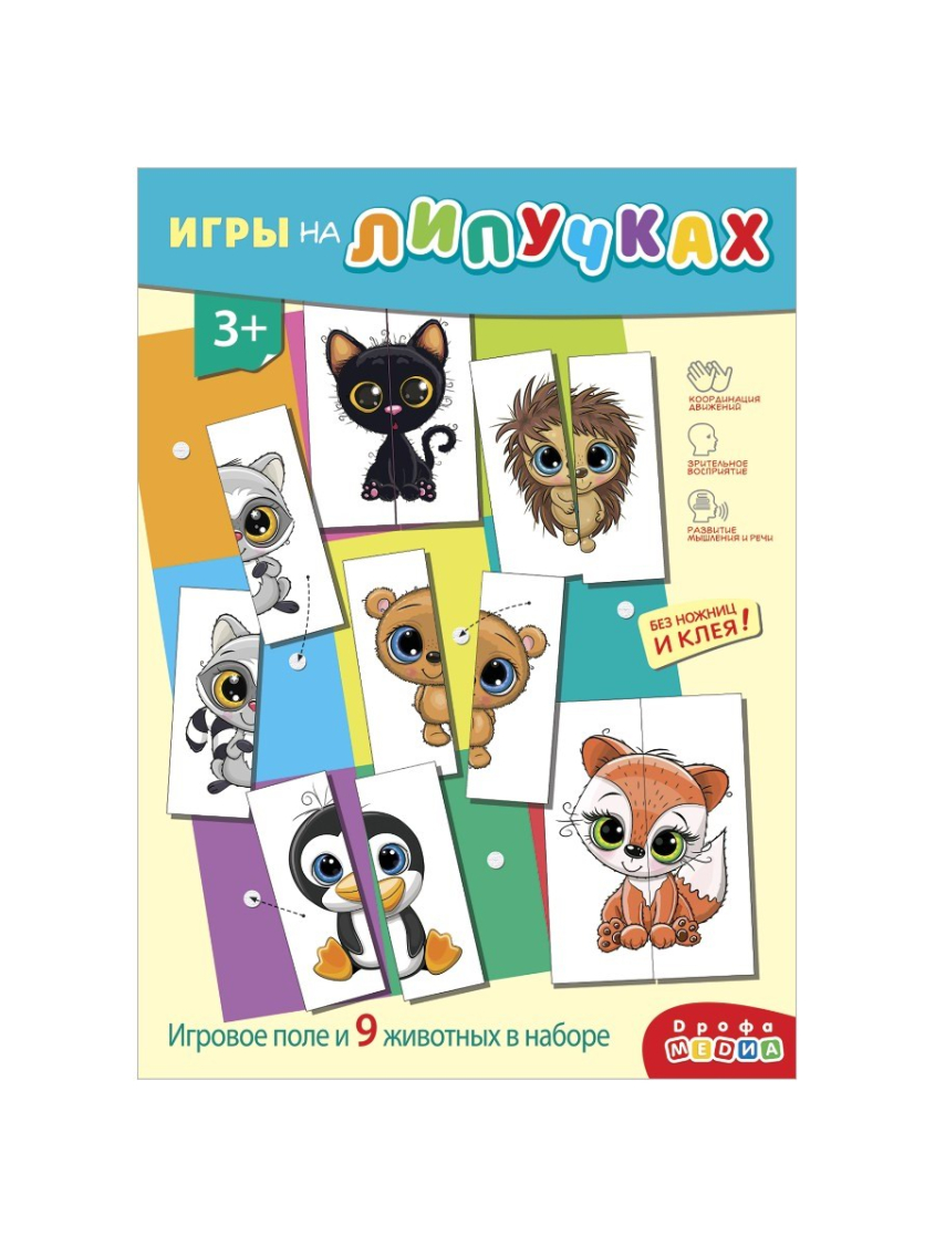 Игра знакомит с животными, учит собирать картинку из двух частей, пользоваться липучками. Развивает внимание, мышление, мелкую моторику.