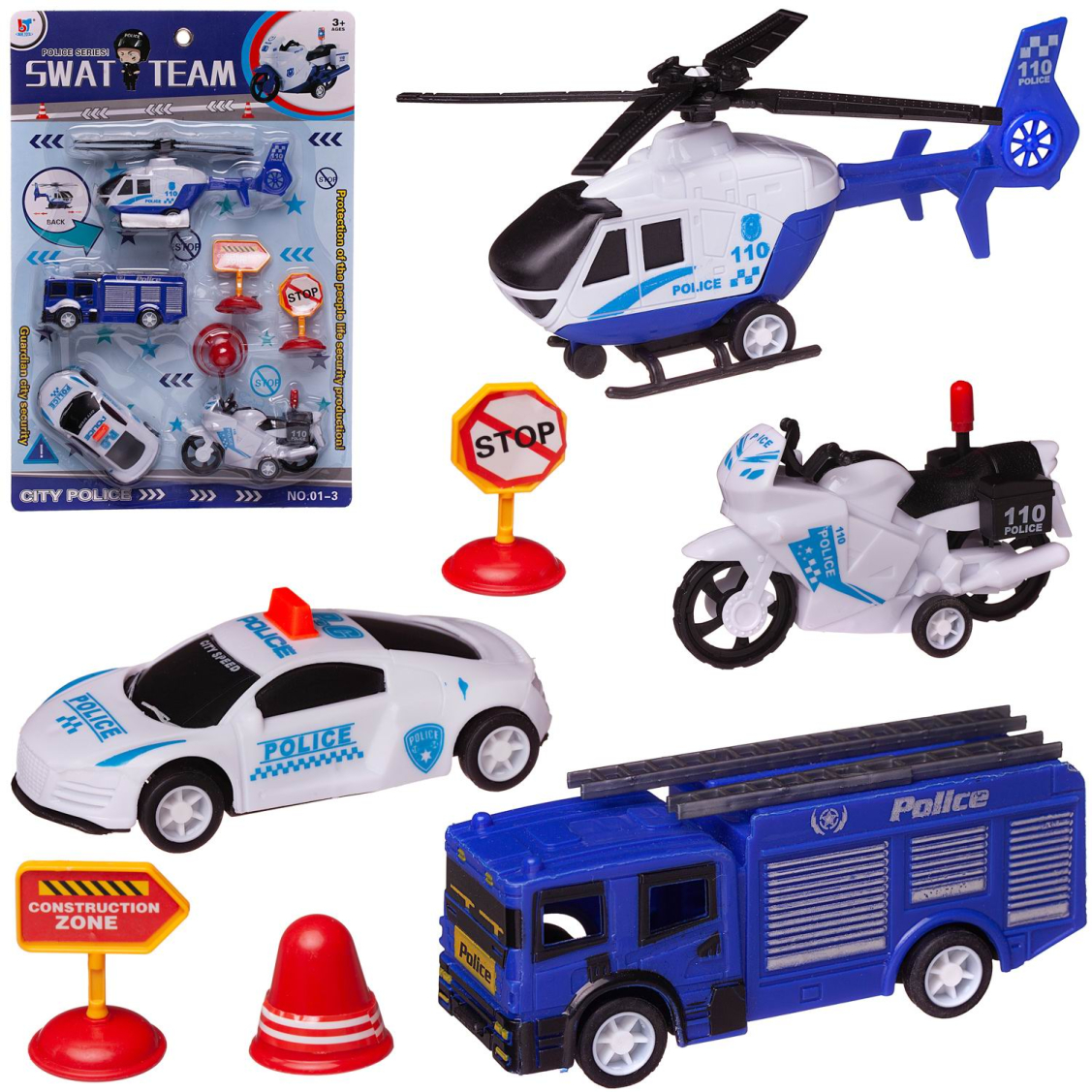 Состав набора: машинка – 2 шт., вертолет – 1 шт., мотоцикл – 1 шт., дорожные знаки – 3 шт.