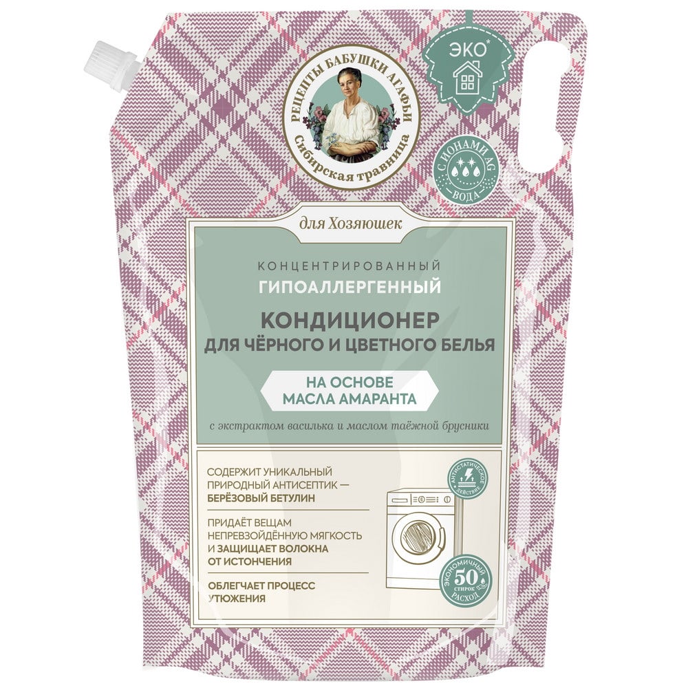 Концентрированный гипоаллергенный кондиционер для чёрного и цветного белья на основе масла амаранта сварен с душой и заботой по рецептам Агафьи Тихоновны Ермаковой. Он содержит активные натуральные компоненты, которые проникают глубоко в структуру тканей, защищая их от выцветания и преждевременного износа. Облегчает процесс глажения и уменьшает возникновение статического электричества. Придаёт необыкновенную мягкость и сохраняет насыщенность тёмных оттенков изделий.