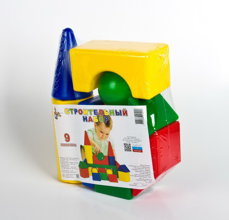 Строительный набор для детей 9 элементов из выдувной пластмассы состоит: