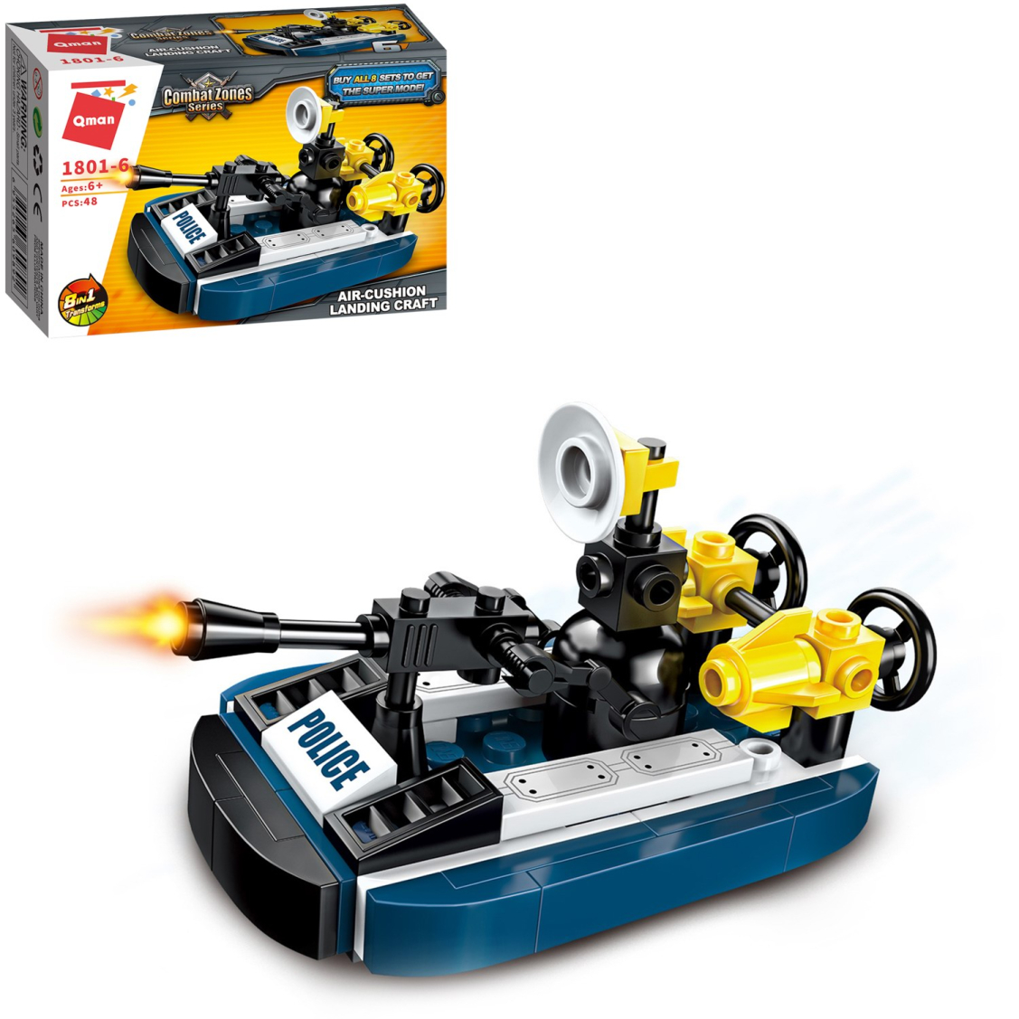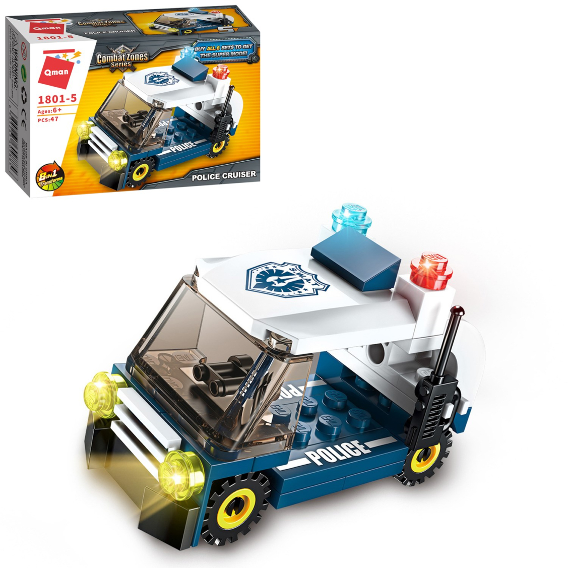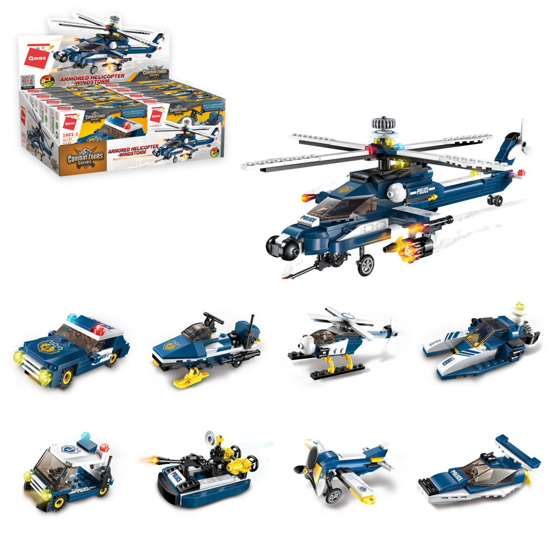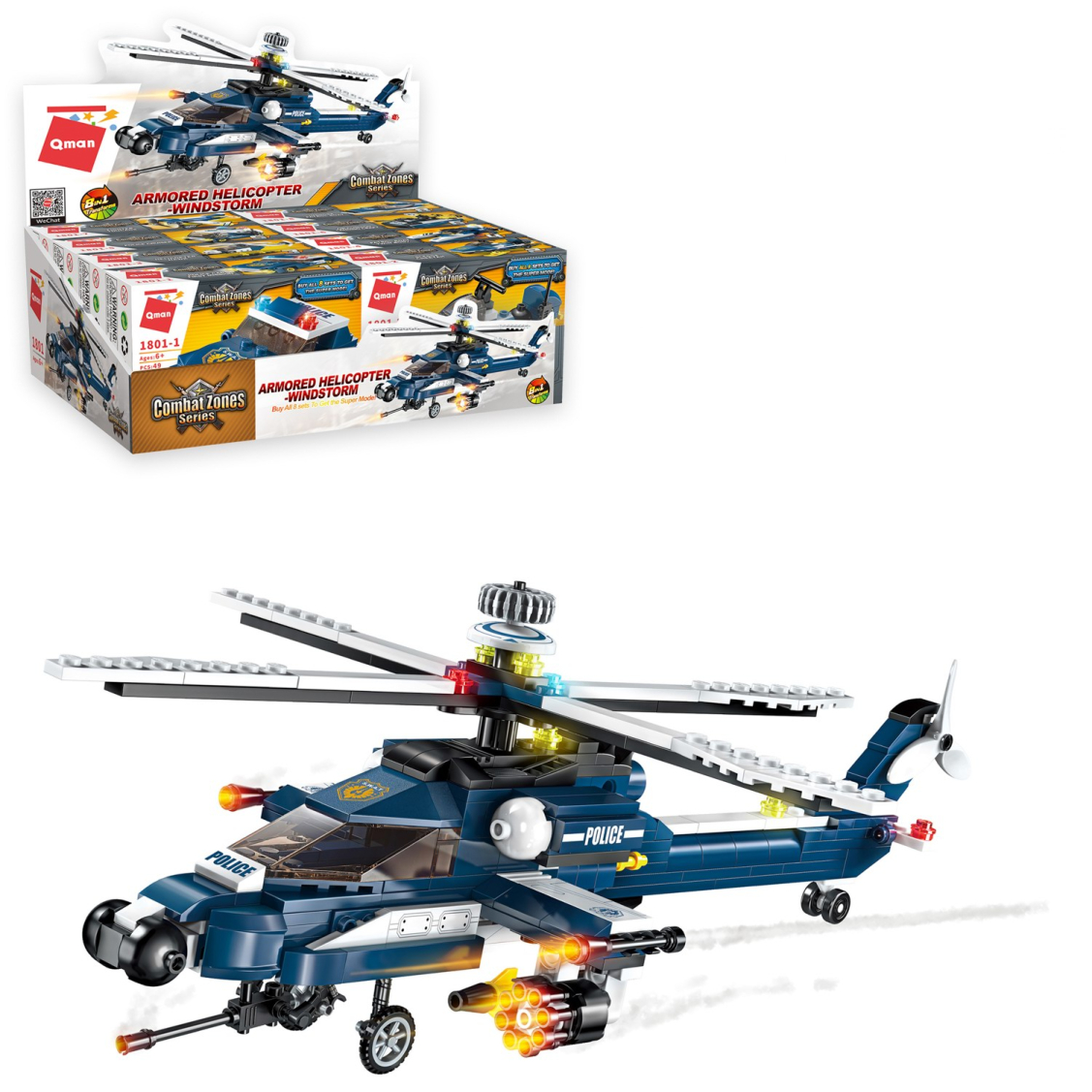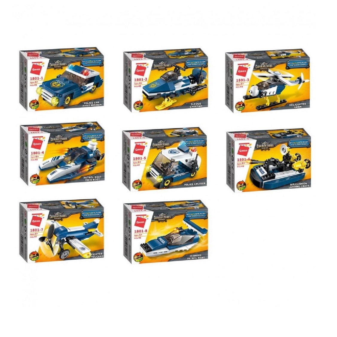 Из каждого набора конструктора от производителя QMAN из серии «Combat Zones» ребенок может собрать собственными руками модель полицейской техники. Если приобрести, собрать и соединить между собой все 8 наборов серии, то получится большой полицейский вертолет. Простое и надежное соединение деталей разных размеров и форм между собой обеспечат специальные крепления. Во время игры ребенок сможет задействовать свою фантазию и придумать интересные сценарии. В процессе сборки и игры с готовой моделью юный конструктор будет развивать мелкую моторику рук, пространственное мышление, внимательность и усидчивость.
