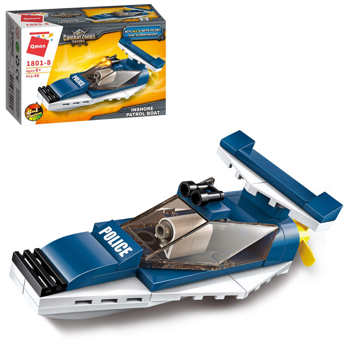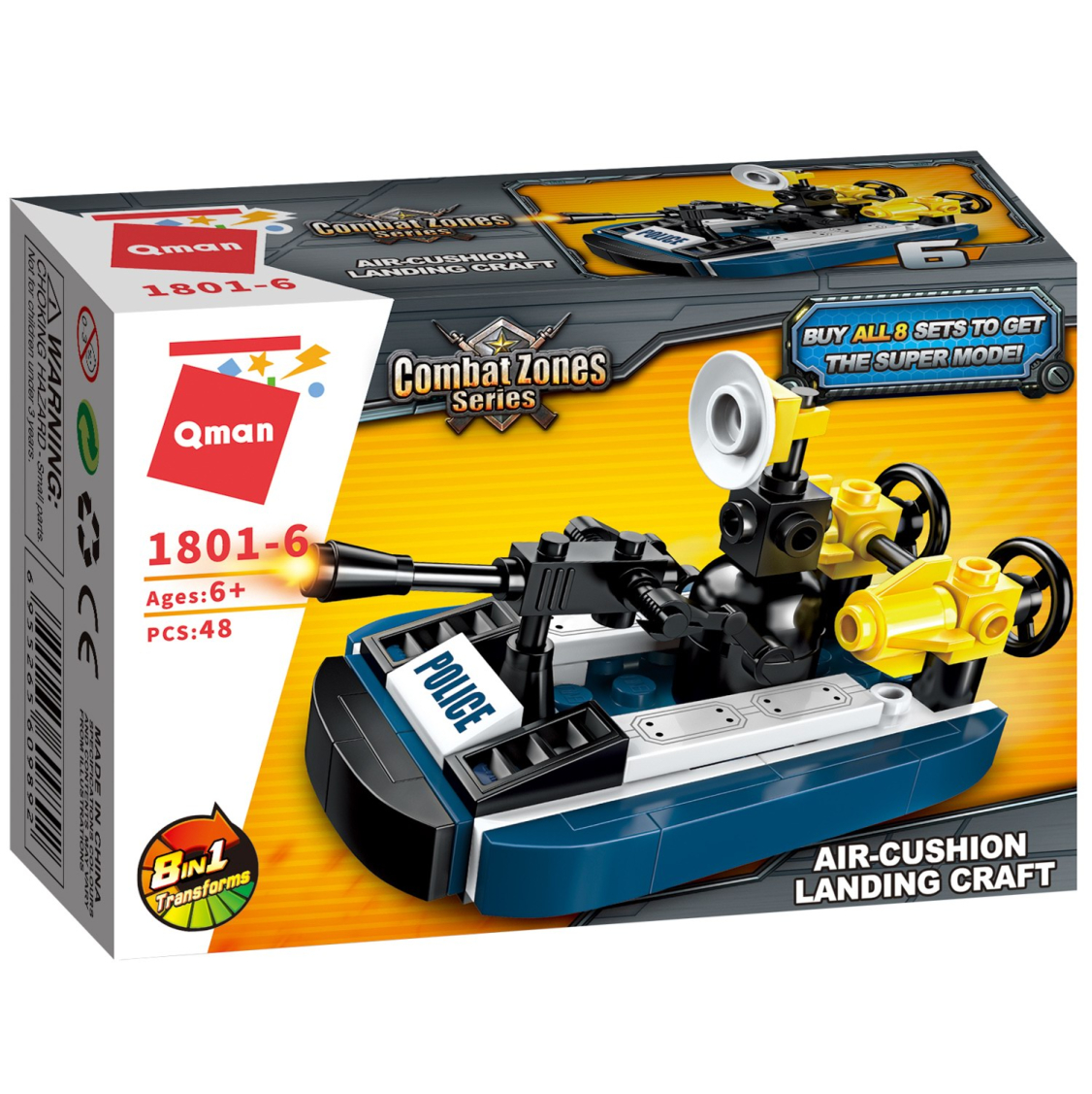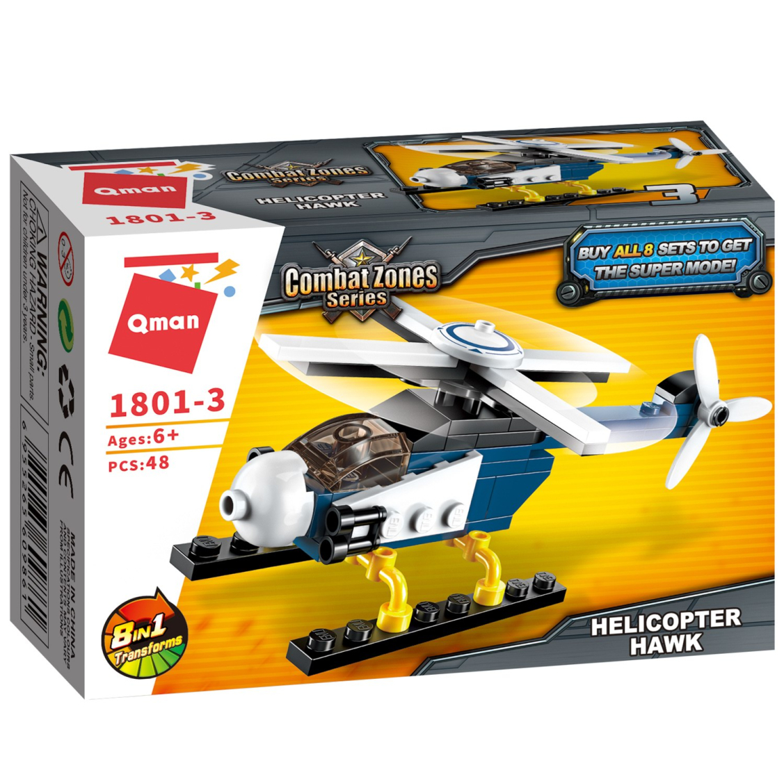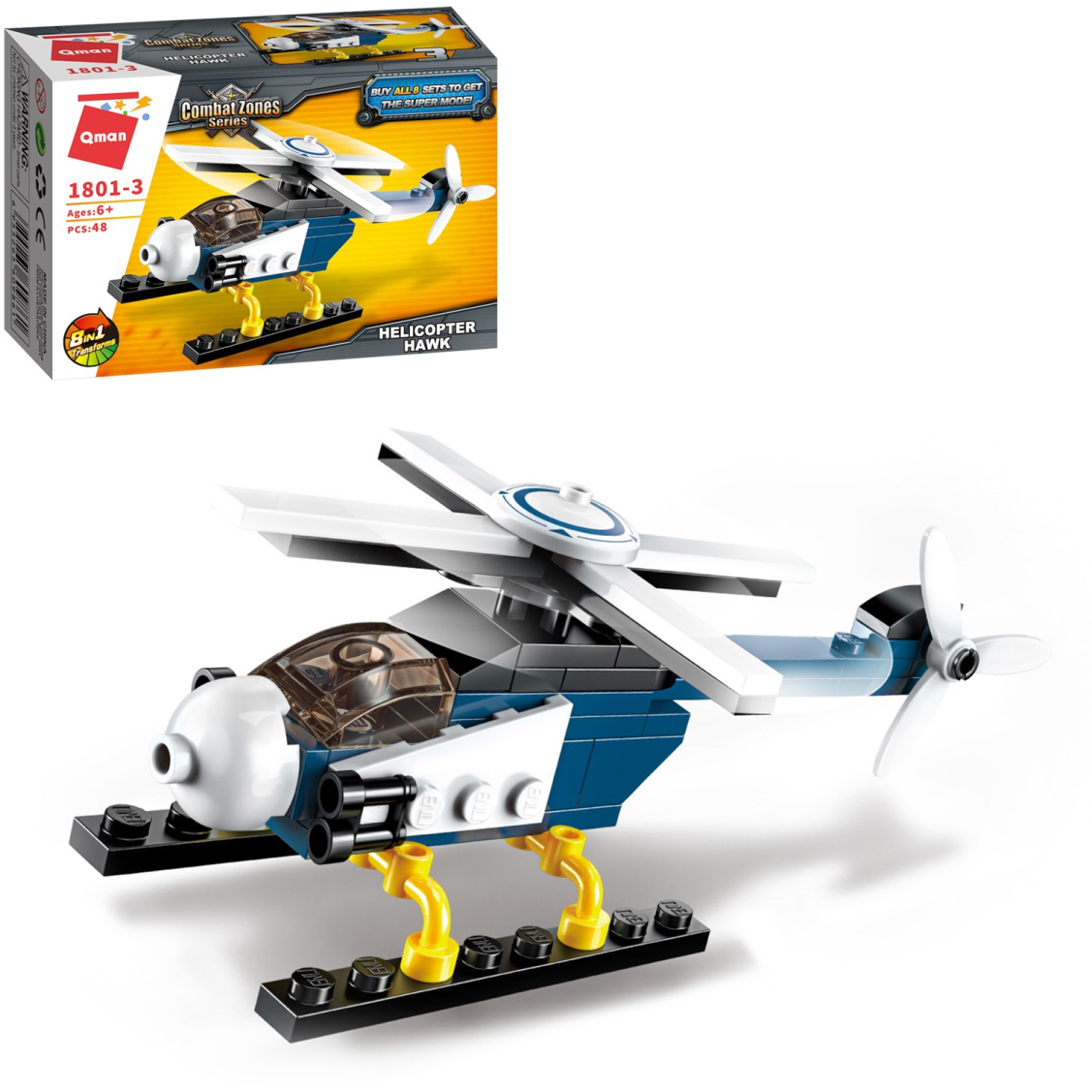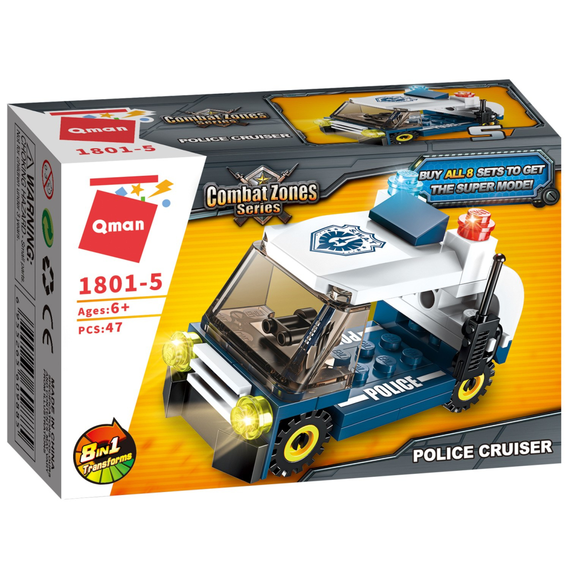 Из каждого набора конструктора от производителя QMAN из серии «Combat Zones» ребенок может собрать собственными руками модель полицейской техники. Если приобрести, собрать и соединить между собой все 8 наборов серии, то получится большой полицейский вертолет. Простое и надежное соединение деталей разных размеров и форм между собой обеспечат специальные крепления. Во время игры ребенок сможет задействовать свою фантазию и придумать интересные сценарии. В процессе сборки и игры с готовой моделью юный конструктор будет развивать мелкую моторику рук, пространственное мышление, внимательность и усидчивость.