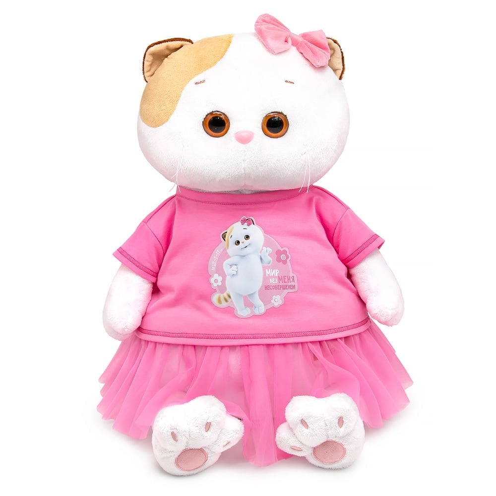 Кошечка Ли-Ли в комплекте цвета розовых леденцов. Трикотажная футболка с авторским принтом в стиле мультсериала и пышная розовая юбочка из тафты. Двойной бантик на ушке Ли-Ли сшит из розового мягкого софта.