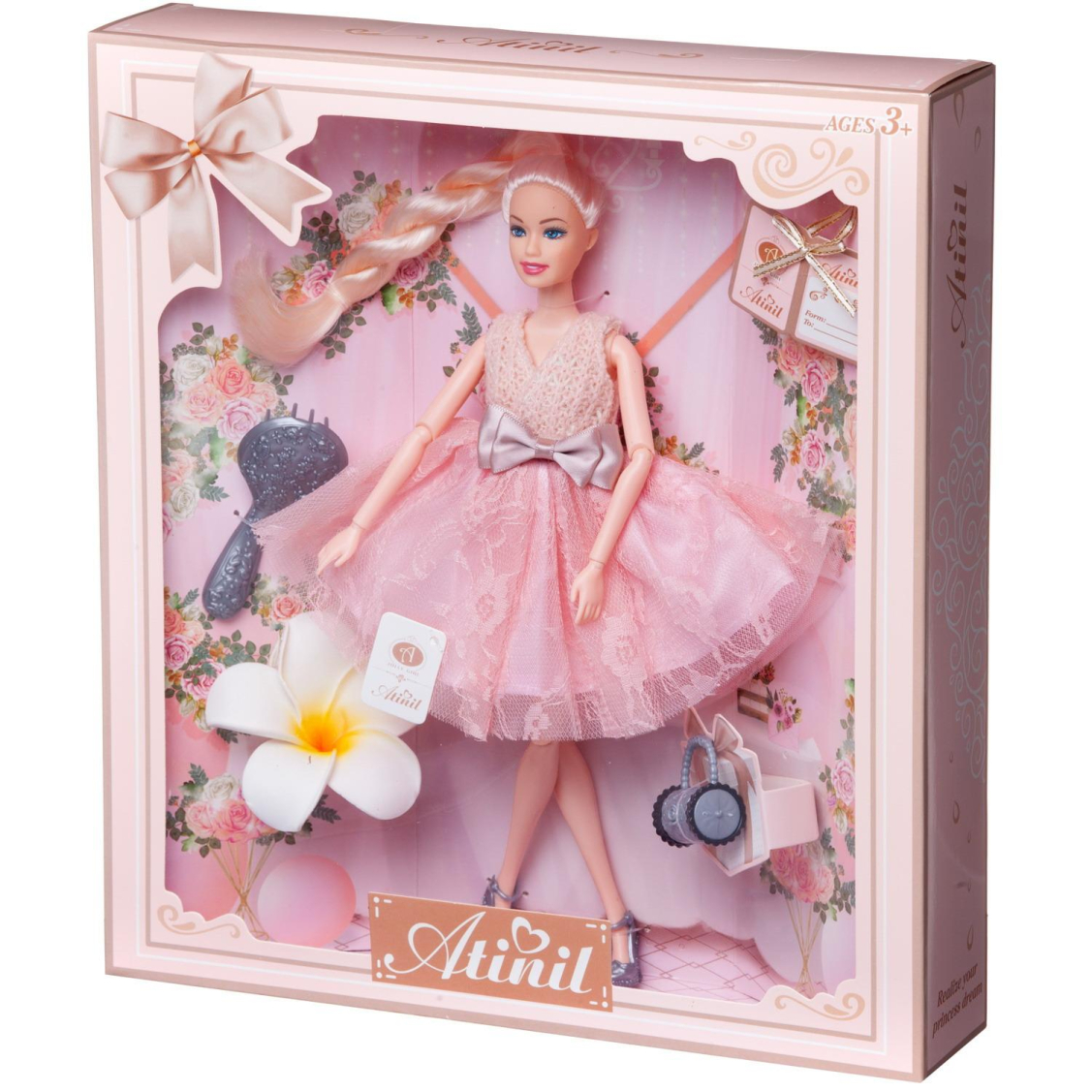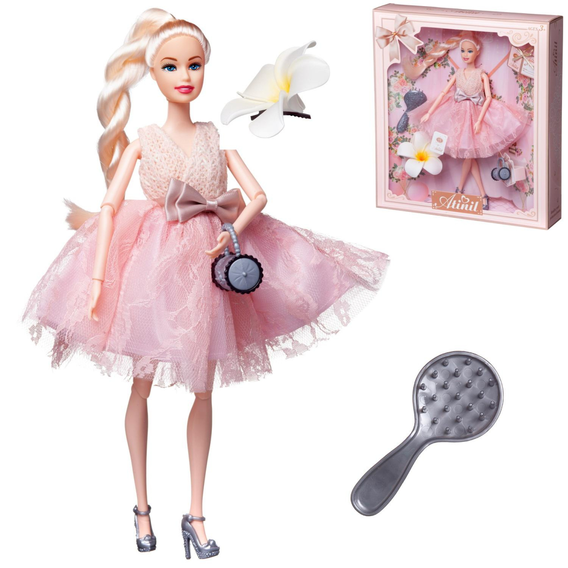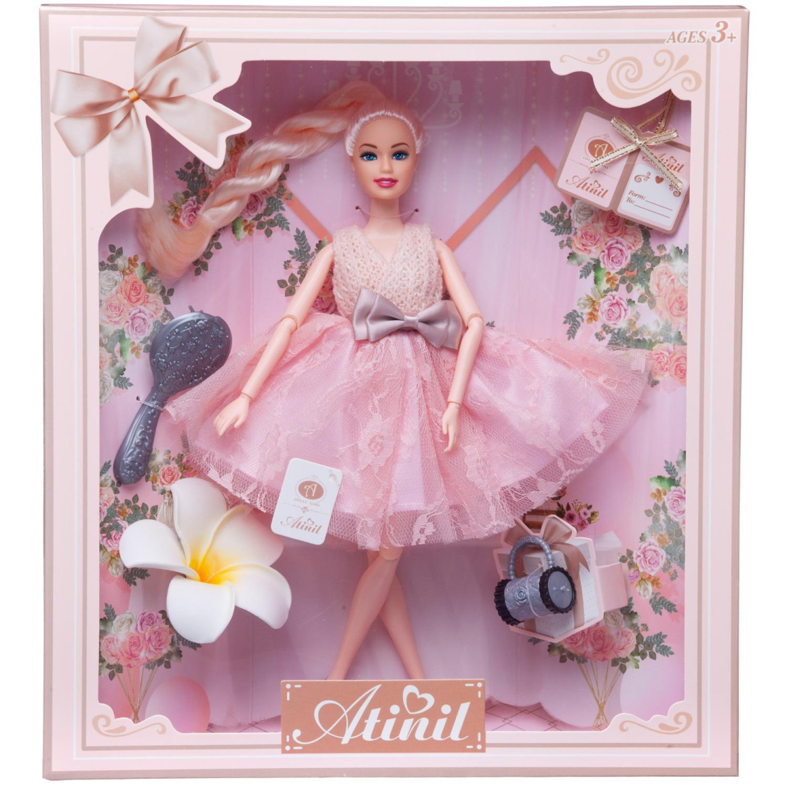 Кукла Atinil выглядит как красивая молодая девушка, которая разбирается в новинках моды и любит следить за собой. Ребенок, играя с такой куклой, сможет придумать множество различных сюжетов. Также в наборе имеются модные аксессуары. У куклы подвижны части тела, благодаря чему в процессе игры девочка сможет менять положение игрушки.