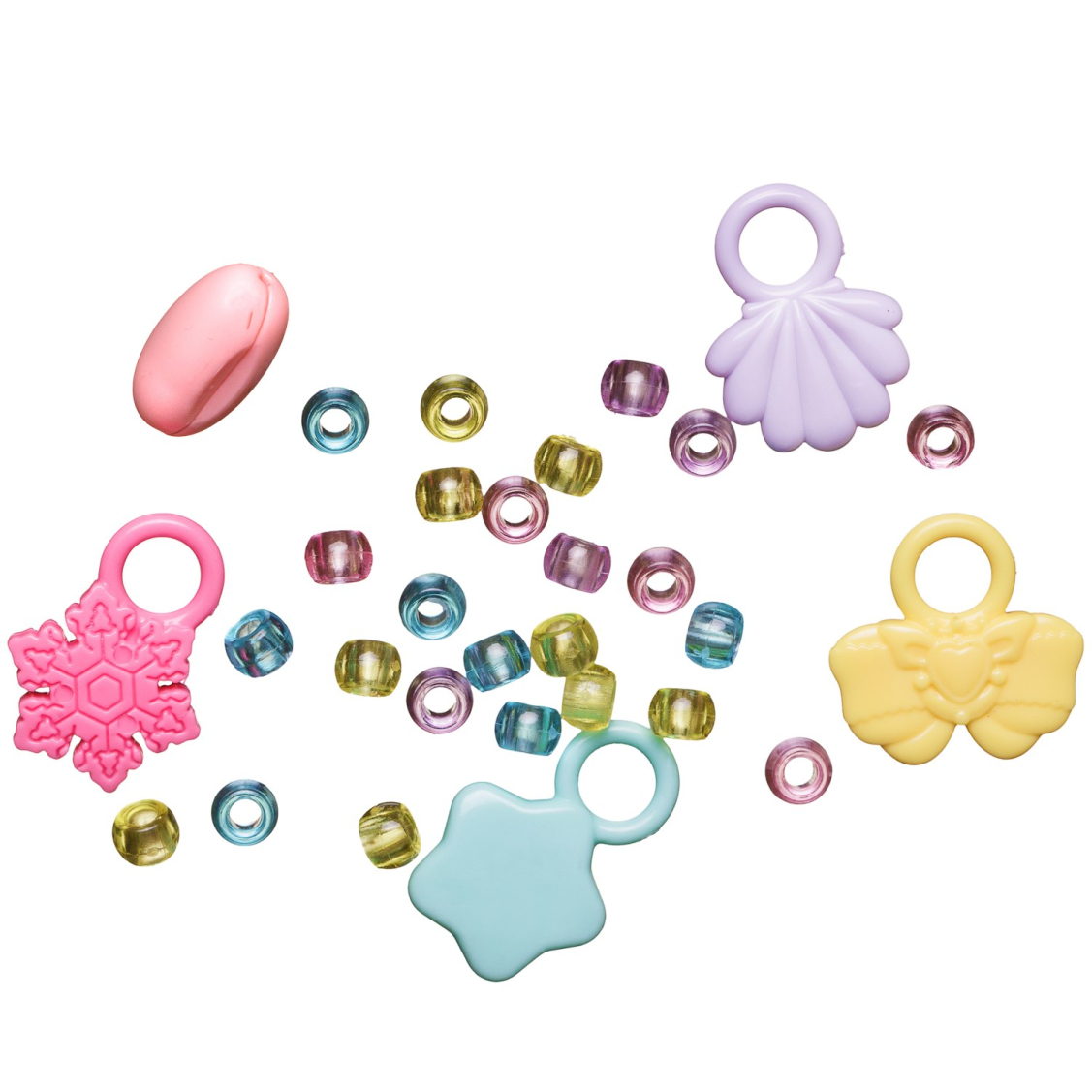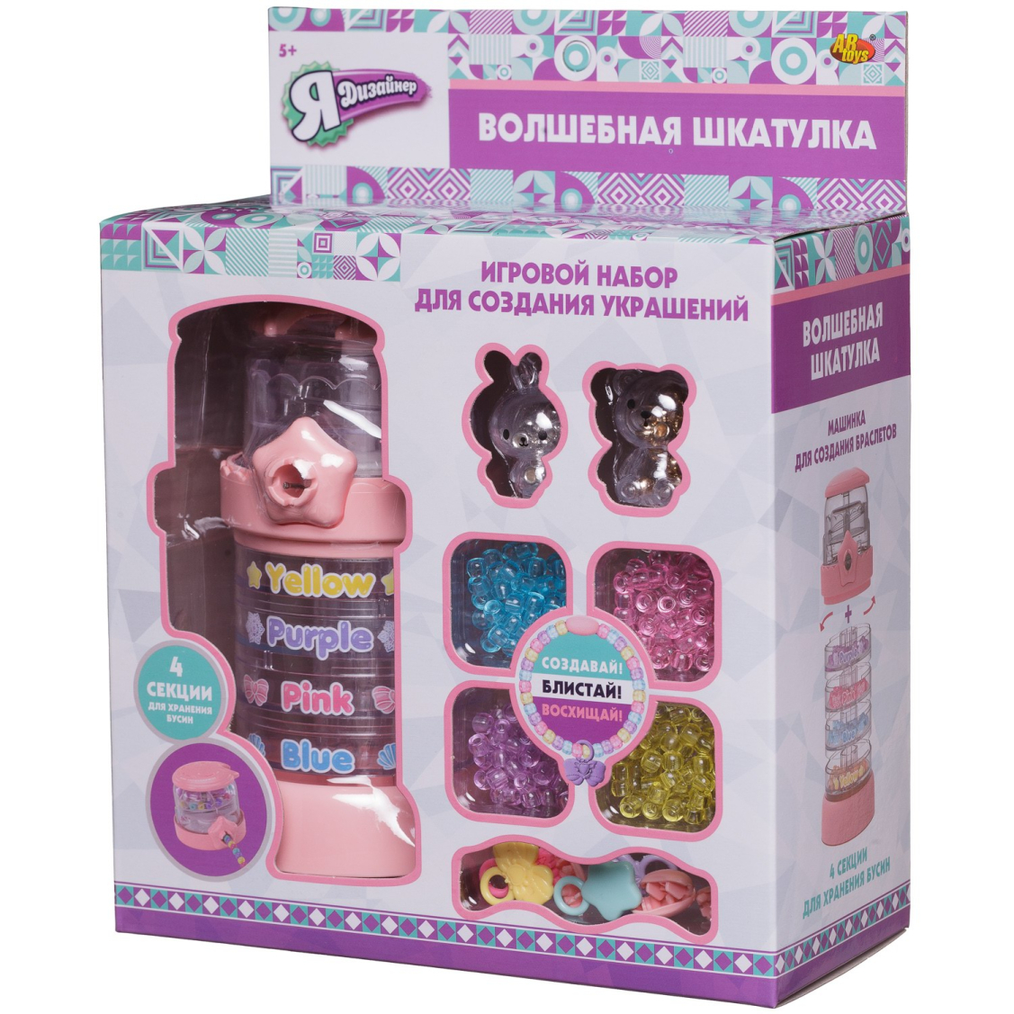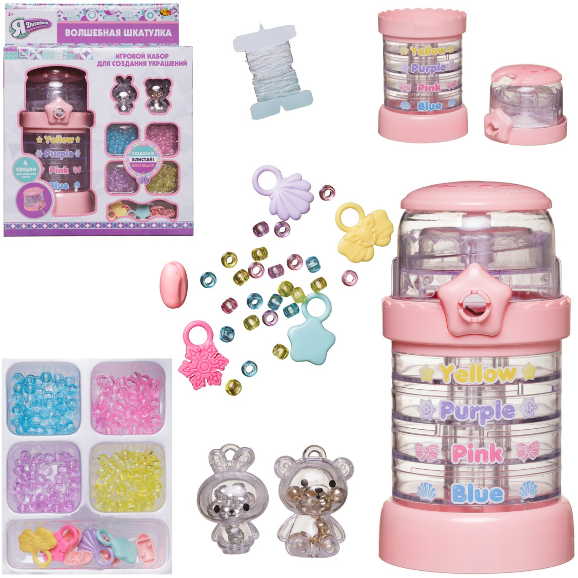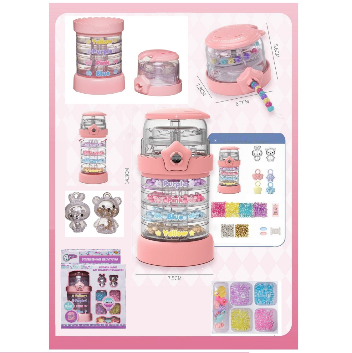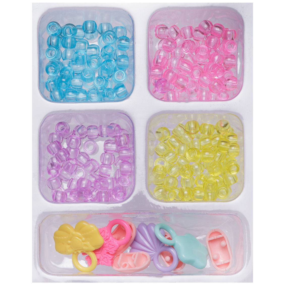 Комплектность: банка с 4 отсеками и машинкой для плетения браслетов – 1 шт, цветные бусины, подвески.