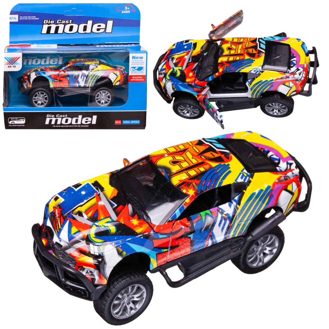 Все мальчишки любят играть с машинками. Игрушечный джип от бренда Junfa будет хорошим дополнением коллекции машинок вашего мальчика. Он имеет яркую расцветку в стиле граффити, открывающиеся передние дверцы, высокую подвеску, крупные колеса, а защита в зоне переднего и заднего бампера убережет машинку в случае непредвиденной игрушечной аварии. Джип оснащен инерционным ходом, если оттянуть машинку назад, а затем отпустить, она быстро поедет вперед. Кузов машинки изготовлен из металла, остальные детали - из пластмассы.