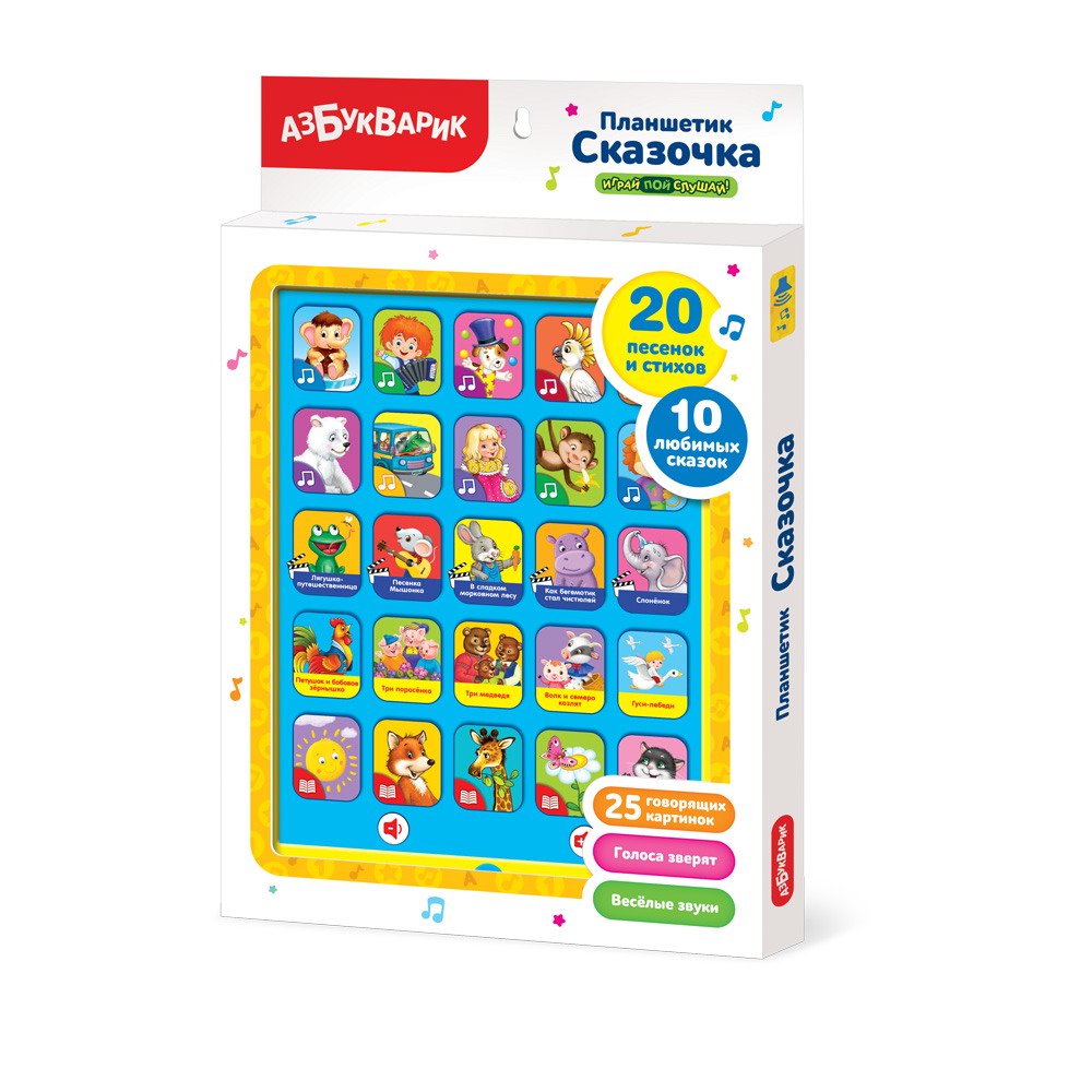 Бестселлер Азбукварика – обучающий планшет «Сказочка» – станет отличным вложением для всестороннего развития ребёнка. В нем собраны любимые потешки, веселые детские песенки, русские народные сказки, стихи о зверятах, добрые мультики.