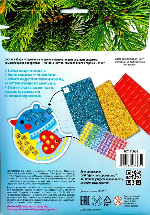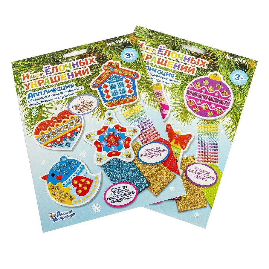 Набор для детского творчества - аппликация «Набор елочных украшений 1» состоит из 4 двусторонних цветных картонных игрушек в виде сердечка, птички, звездочки и домика. Ребенку необходимо украсить их объемными самоклеящимися квадратиками и стразами. Этот процесс превосходно разовьет моторику неловких пальчиков и стимулирует творческие наклонности.