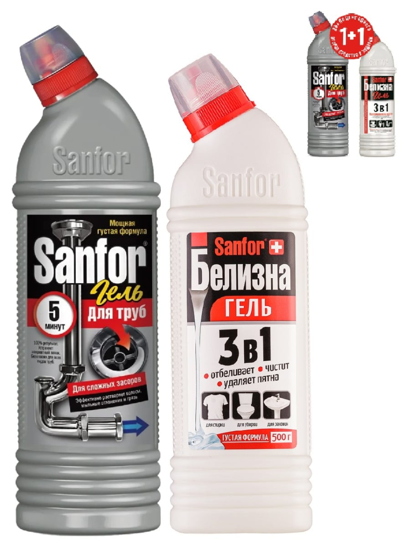 Набор чистящих средств: SANFOR Средство для прочистки труб TURBO: Мгновенная Чистота Ваших Труб! Забудьте о засорах! Sanfor Turbo 1000мл – мощное и эффективное средство для быстрой прочистки труб.