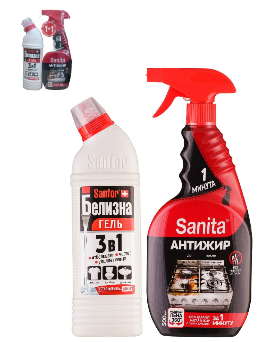 Набор чистящих средств: SANITA Спрей АНТИЖИР 1 минута: Чистящее спрей средство для уборки кухни Sanita Антижир «1 минута» – это универсальное мощное решение, которое поможет вам легко и эффективно очистить различные поверхности в вашей кухне. Благодаря своей мощной формуле быстро и эффективно удаляет жирные пятна, нагар, въевшуюся грязь с любых кухонных поверхностей: плит, микроволновых печей, вытяжек, духовых шкафов. Sanfor Белизна гель, 3в1: Многофункциональное средство комплексного действия (с хлором) с инновационной формулой отбеливания пятен предназначено для отбеливания и удаления пятен перед стиркой, а также дезинфекции и чистки сантехники и труб.Sanfor "Белизна гель" 3 в 1 легко справляется со сложными пятнами, желтизной и загрязнениями, уничтожает микробы и бактерии.Благодаря густой консистенции гель равномерно распределяется, не стекает, экономично расходуется. Флакон оснащен антискользящей поверхностью, его удобно удерживать в руке во время уборки, а также блокиратором крышки для защиты от детей.