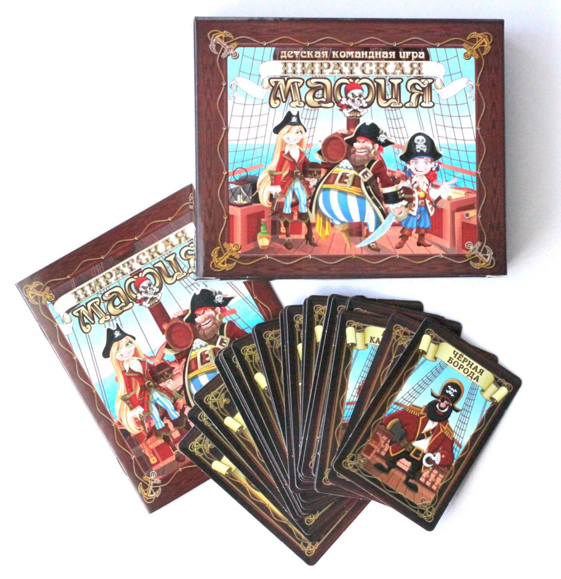 Командная настольная карточная игра «Пиратская мафия». Состав: карточки персонажей – 14 шт. (5,5 х 8,5 см), карточки предметов – 14 шт. (5,5 х 8,5 см), инструкция. Материалы: бумага, картон. Для детей 6–12 лет и их родителей, для 3–15 игроков. Развивает навыки общения в команде, логику, актёрские способности, креативное мышление и умение видеть причинно-следственные связи.