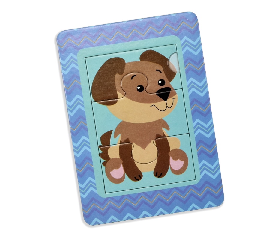 Пазл состоит из 3 крупных элементов (7х7 см) и основы в виде рамки (10,5х14,5 см). На основе напечатан рисунок щенка. Изображения наносятся с помощью прямой печати, что обеспечивает износостойкость картинки.