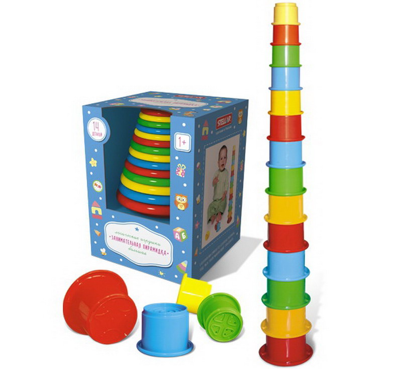 Эта занимательная пирамидка поможет малышу развить базовые навыки еще до года. Она состоит из 14 деталей разного размера, которые, тем не менее, при правильном соединении легко превращаются в довольно высокую пирамиду. Игрушка развивает мелкую моторику ру