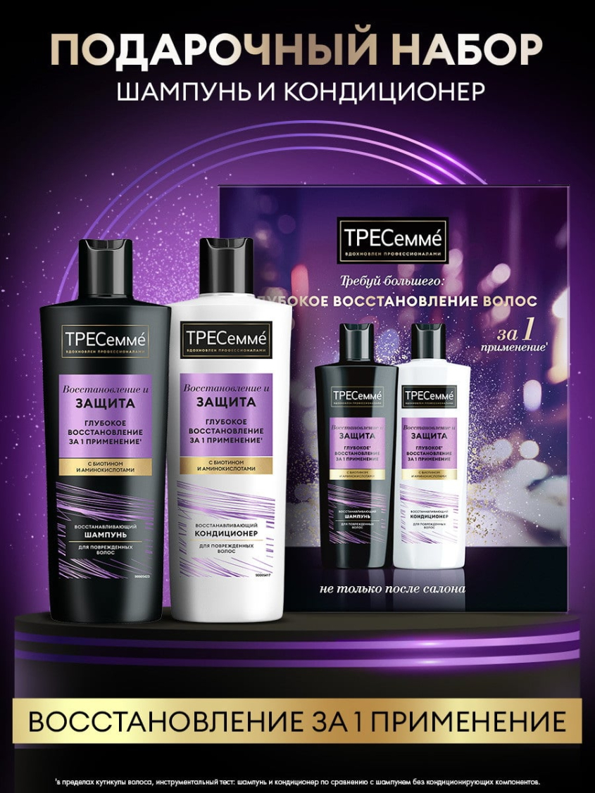 Подарочный набор для женщин ТРЕСеммé Глубокое восстановление и защита — это идеальный подарок для женщин и девушек, чьи волосы стали ослабленными и поврежденными из-за регулярных термических укладок и окрашиваний. В стильной подарочной упаковке содержатся базовые средства для ежедневного ухода за поврежденными локонами: шампунь для волос и кондиционер, которые обеспечивают глубокое’ восстановление и питание прядей.
