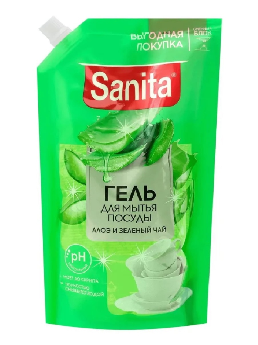 SANITA Средство для мытья посуды "Алоэ и зеленый чай", дой-пак, 900 г