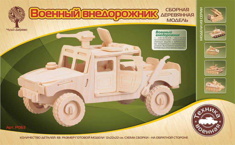 Сборная деревянная модель. Комплект включает в себя набор деталей, вырезанных на листовом дереве (фанера); схему сборки. Детали скрепляются в порядке и очередности, обозначенной в инструкции. Для прочности соединений рекомендуется использовать клей.