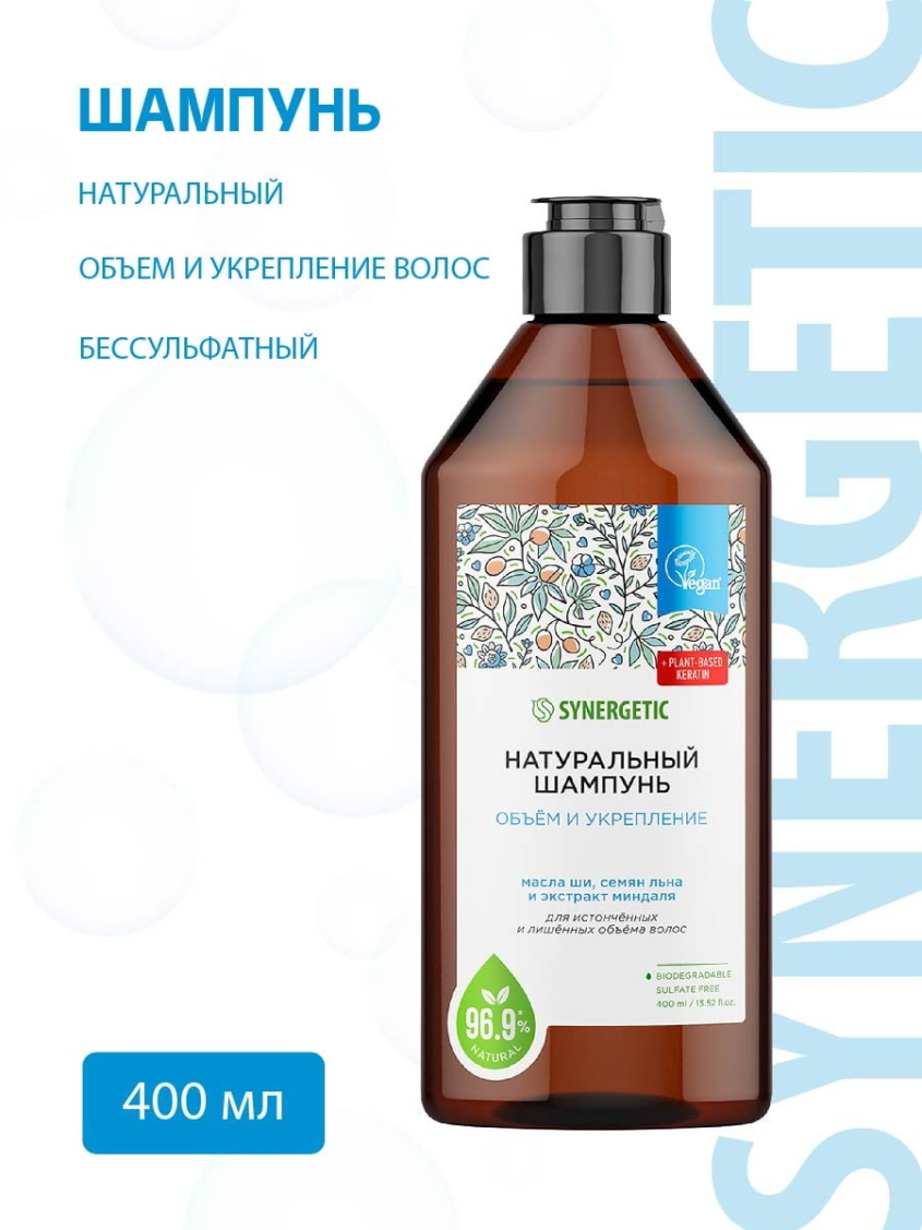 Натуральный бессульфатный шампунь SYNERGETIC "Объём и укрепление волос" - эффективное средство для очищения кожи головы и истонченных, лишенных объема волос, более чем на 98% состоящее из натуральных компонентов. Бессульфатный шампунь обеспечивает деликатное очищение, эффективный уход за волосами и защиту кожу головы. Растительный кератин восстанавливает структуру волос изнутри, делая их плотными, сильными и упругими. Специально разработанная формула на основе масел ши и семян льна питает тонкие ослабленные волосы и увеличивает объем. Активные компоненты шампуня укрепляют волосы и стимулируют восстановление кератиновых волокон. Экстракты миндаля и маракуйи придают волосам эластичность и блеск. Мультифункциональный компонент натурального происхождения софоролипид мягко очищает кожу головы и сохраняет естественный микробиом.