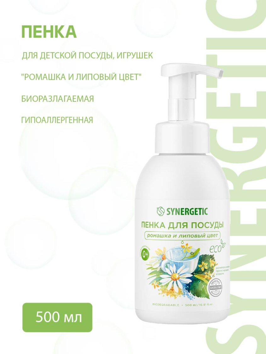 SYNERGETIC Пенка для мытья посуды, детской посуды и игрушек "Ромашка и липовый цвет", биоразлагаемая, гипоаллергенная, 500 мл